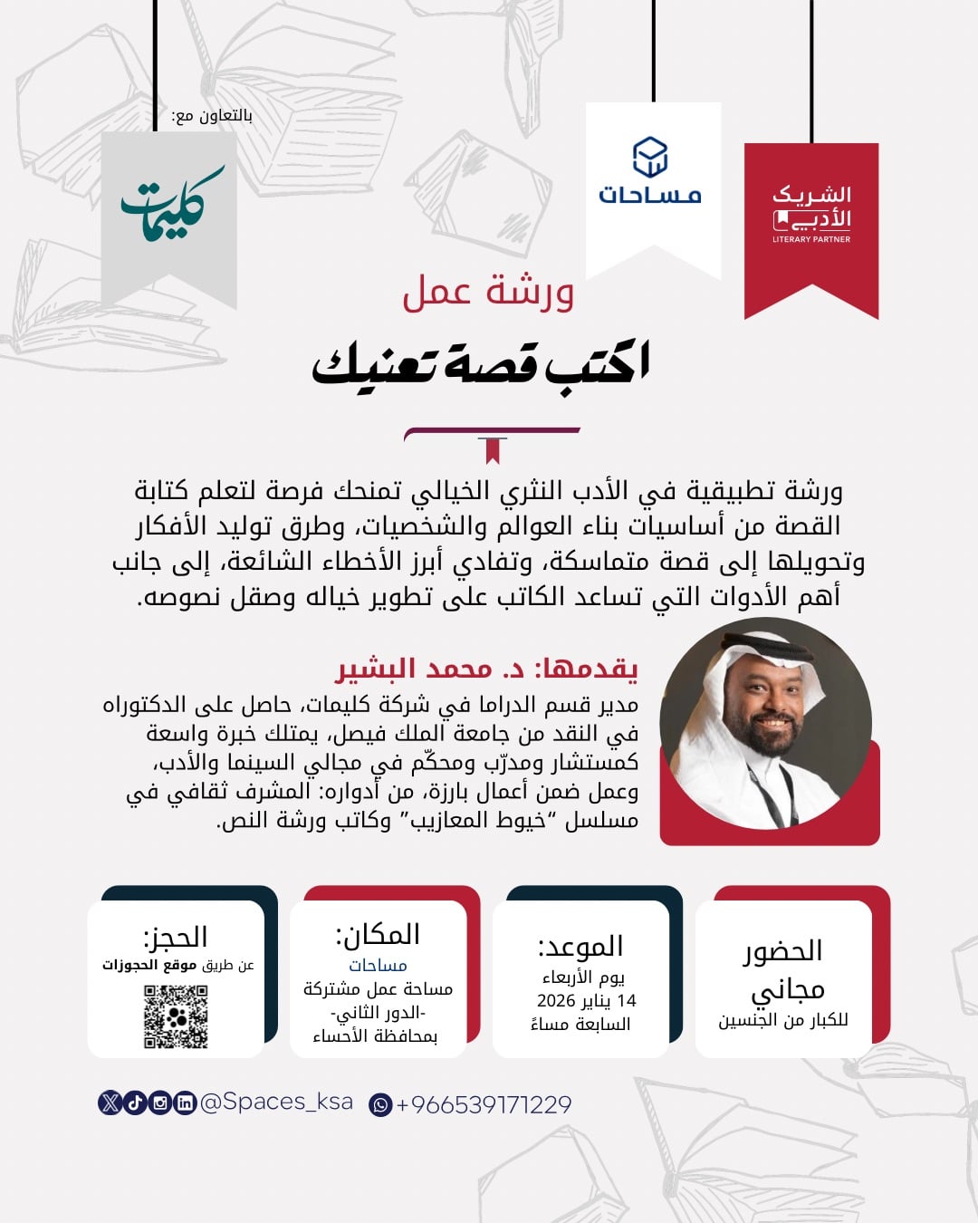 يسرنا دعوتكم لحضور ورشة عمل بعنوان "اكتب قصة تعنيك" ضمن فعاليات #الشريك_الأدبي 📚