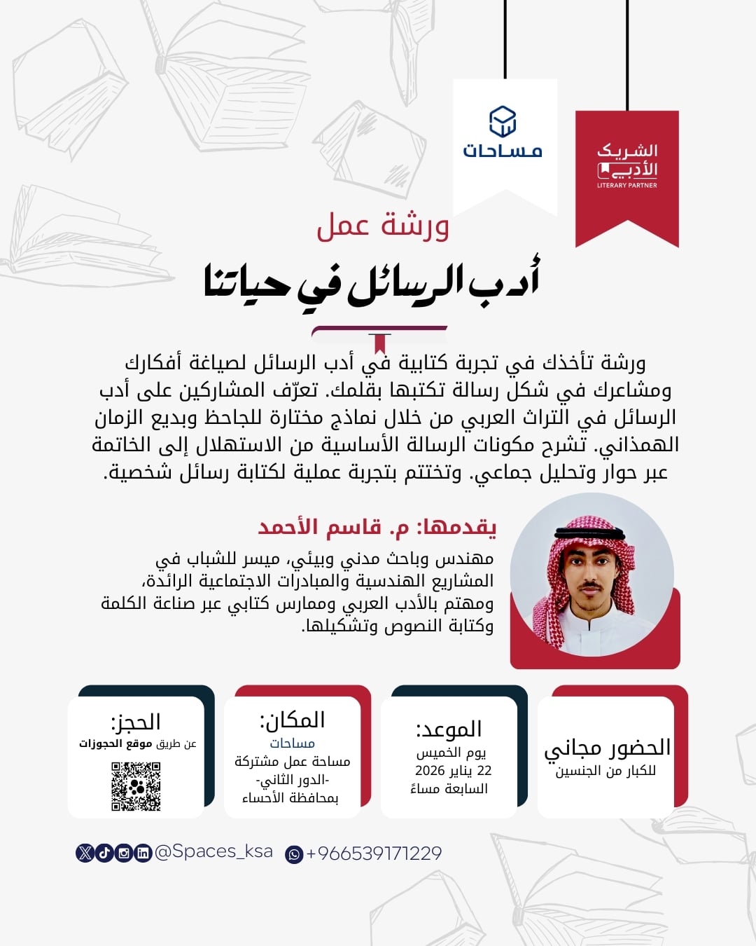 يسرنا دعوتكم لحضور ورشة عمل بعنوان "أدب الرسائل في حياتنا" ضمن فعاليات #الشريك_الأدبي 📚